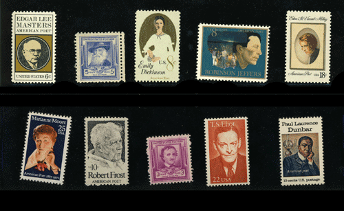 A series of United States postage stamps featuring poets Edgar Lee Masters, Walt Whitman, Emily Dickinson, Robinson Jeffers, Edna St. Vincent Millay, Marianne Moore, Robert Frost, Edgar Allan Poe, T. S. Eliot, and Paul Laurence Dunbar.