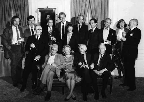 Taken on the occasion of the Academy's 45th Anniversary, Marie Bullock is framed by Robert Fitzgerald, Howard Nemerov, Stanley Kunitz, and William Meredith in the front. Behind them are W. S. Merwin, John Hollander, James Merrill, Mark Strand, May Swenson, David Wagoner, Daniel Hoffman, Anthony Hecht, Mona Van Duyn, and Robert Penn Warren in the back.