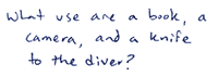 So, if this poem is an extended metaphor, the next questions might concern the necessary preparations for the dive: the book, the camera, and the knife. What implications are present in these details? (This is a good general question.) The book suggests a history or previous stories about the "wreck," whatever it may be. The camera is a device for recording what is factually present, as opposed to what is purportedly present. And the knife suggests danger. The last two are consistent with an actual wreck.