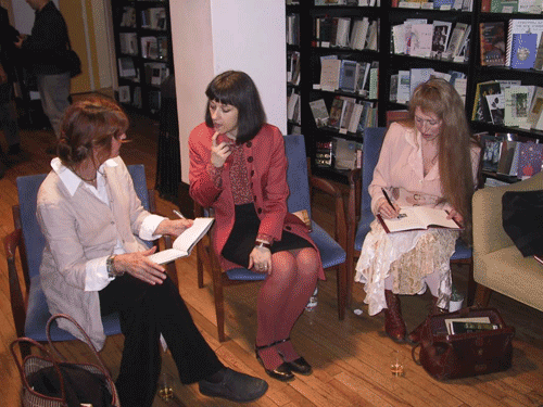 (Left to right) Deborah Digges, former Academy of American Poets Executive Director Tree Swenson, and Lucie Brock-Broido sitting together before a reading.