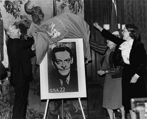 Lyn Chase and Helen Burns unveiling T. S. Eliot’s 22-cent stamp at a ceremony inaugurating a series of poet stamps put out by the U.S. Postal Service.